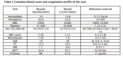 On examination, he was noted to be in apparently healthy state, with a robust build and stable vital signs. Abdominal findings were otherwise unremarkable and there were no stigmata of chronic liver disease on systemic evaluation. Laboratory results revealed a hemoglobin of 13.8 g/dL, MCV of 87 fL and a normal white blood cell count, while platelet count was low at 43,000/µL. No hemolysis was evident on peripheral smear: His direct bilirubin, LDH and liver function tests were all within normal limits (Table 1 and 2). Viral hepatitis serologies (HBsAg and anti-HCV) were negative, and abdominal ultrasound did not indicate abnormal liver morphology. Fibroscan showed no signs of liver fibrosis and the liver elasticity was within normal limits. ANA, dsDNA and RA factor were performed to rule out autoimmune causes for hemolysis and were found to be within normal limits.